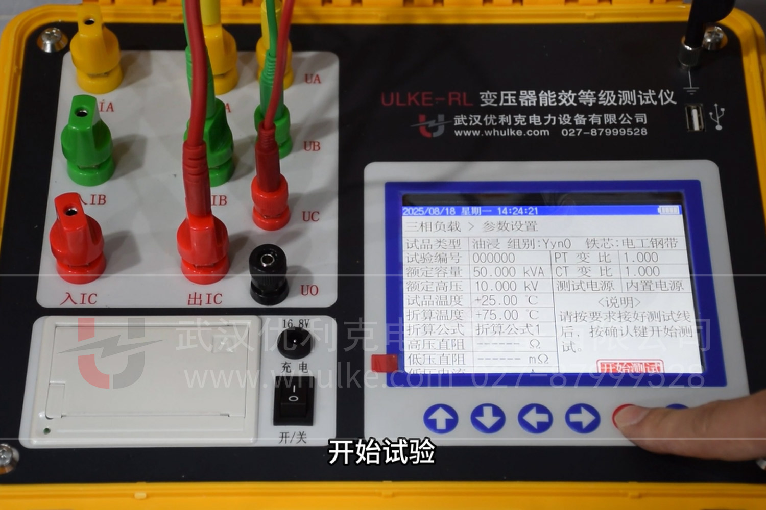 參數設置:啟動測試儀,輸入變壓器型號、額定容量、額定電壓等基礎參數;選擇能效測試模式(如空載損耗測試、負載損耗測試,